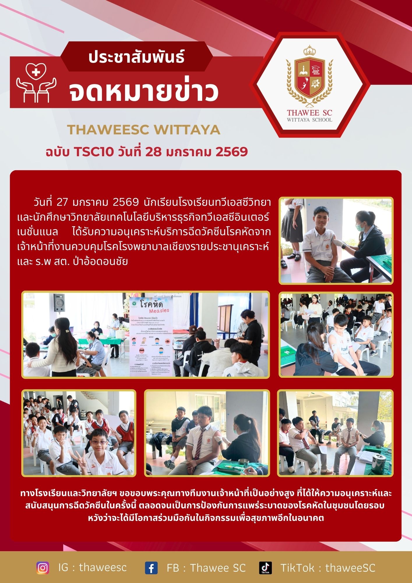 ทางโรงเรียนและวิทยาลัยฯ ขอขอบพระคุณทางทีมงานเจ้าหน้าที่เป็นอย่างสูง ที่ได้ให้ความอนุเคราะห์และสนับสนุนการฉีดวัคซีนในครั้งนี้ ตลอดจนเป็นการป้องกันการแพร่ระบาดของโรคหัดในชุมชนโดยรอบ หวังว่าจะได้มีโอกาสร่วมมือกันในกิจกรรมเพื่อสุขภาพอีกในอนาคต วันที 27 มกราคม 2569 ณ โรงเรียนทวีเอสซีวิทยา จ.เชียงราย