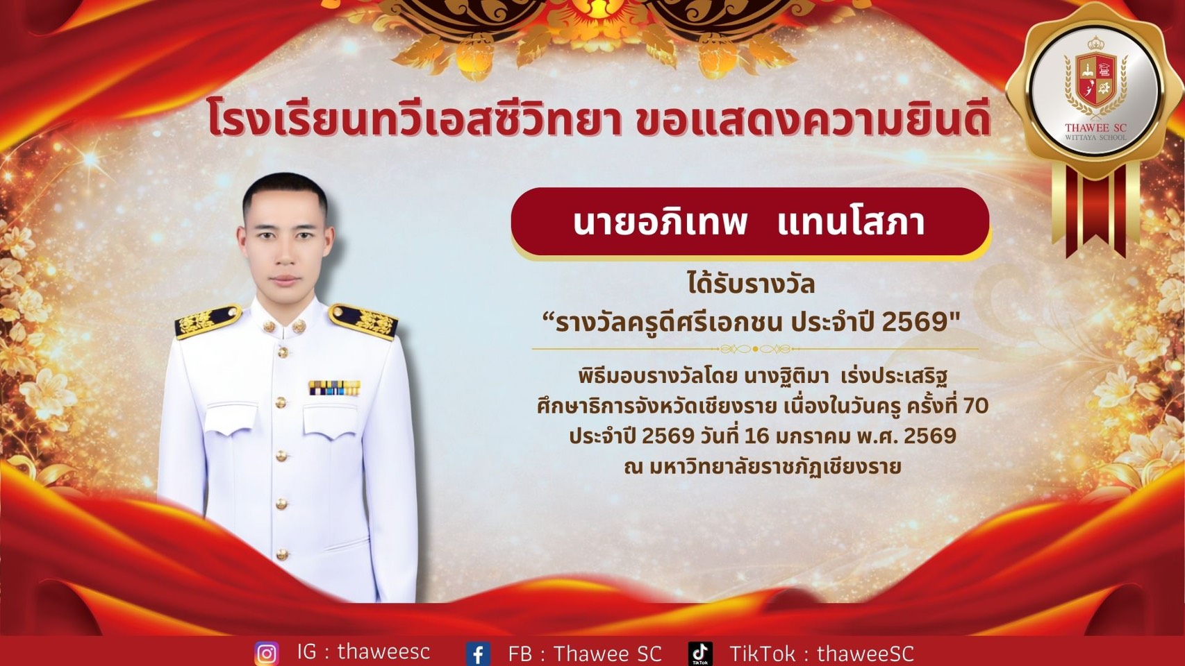 โรงเรียนทวีเอสซีวิทยา ขอแสดงความยินดี นายอภิเทพ แทนโสภา ได้รับรางวัล “รางวัลครูดีศรีเอกชน ประจำปี 2569" พิธีมอบรางวัลโดย นางฐิติมา เร่งประเสริฐ ศึกษาธิการจังหวัดเชียงราย เนื่องในวันครู ครั้งที่ 70 ประจำปี 2569