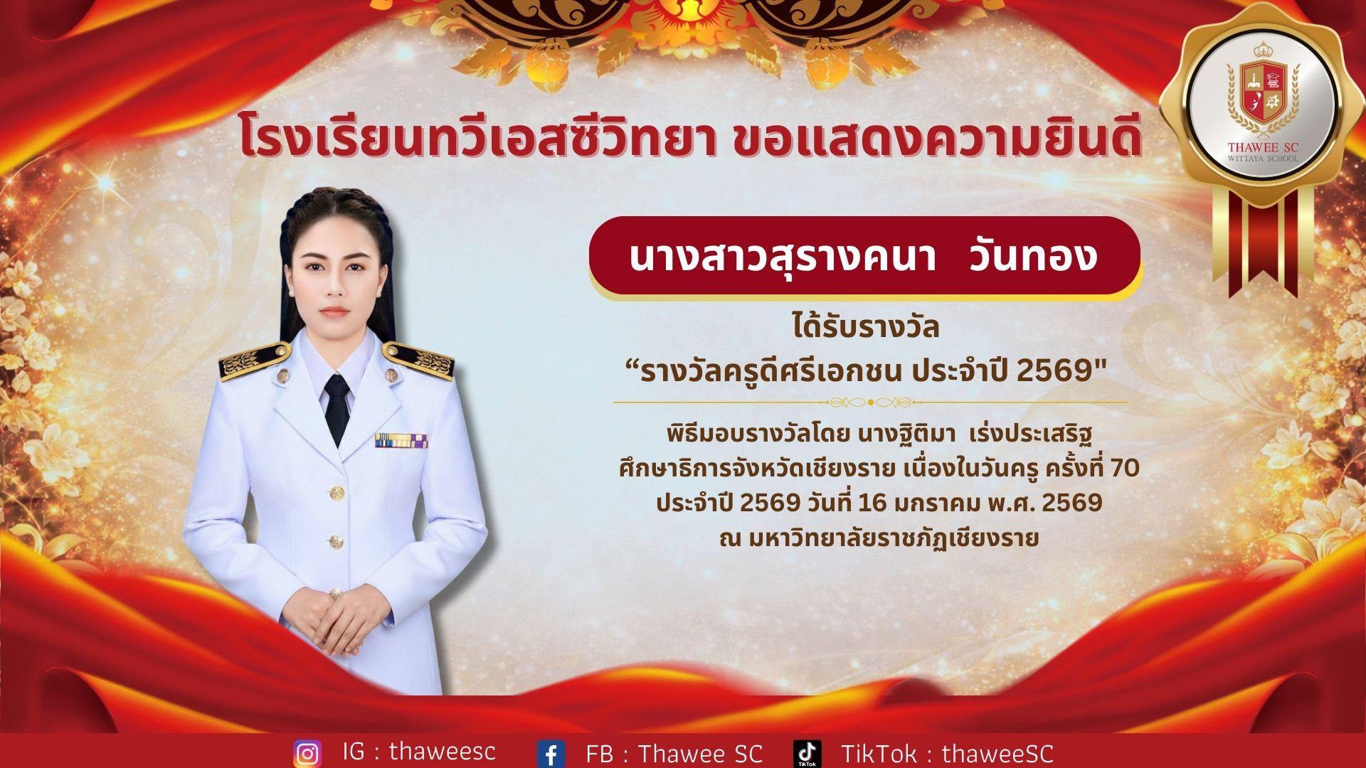โรงเรียนทวีเอสซีวิทยา ขอแสดงความยินดี นางสาวสุรางคนา วันทอง ได้รับรางวัล “รางวัลครูดีศรีเอกชน ประจำปี 2569" พิธีมอบรางวัลโดย นางฐิติมา เร่งประเสริฐ ศึกษาธิการจังหวัดเชียงราย เนื่องในวันครู ครั้งที่ 70 ประจำปี 2569