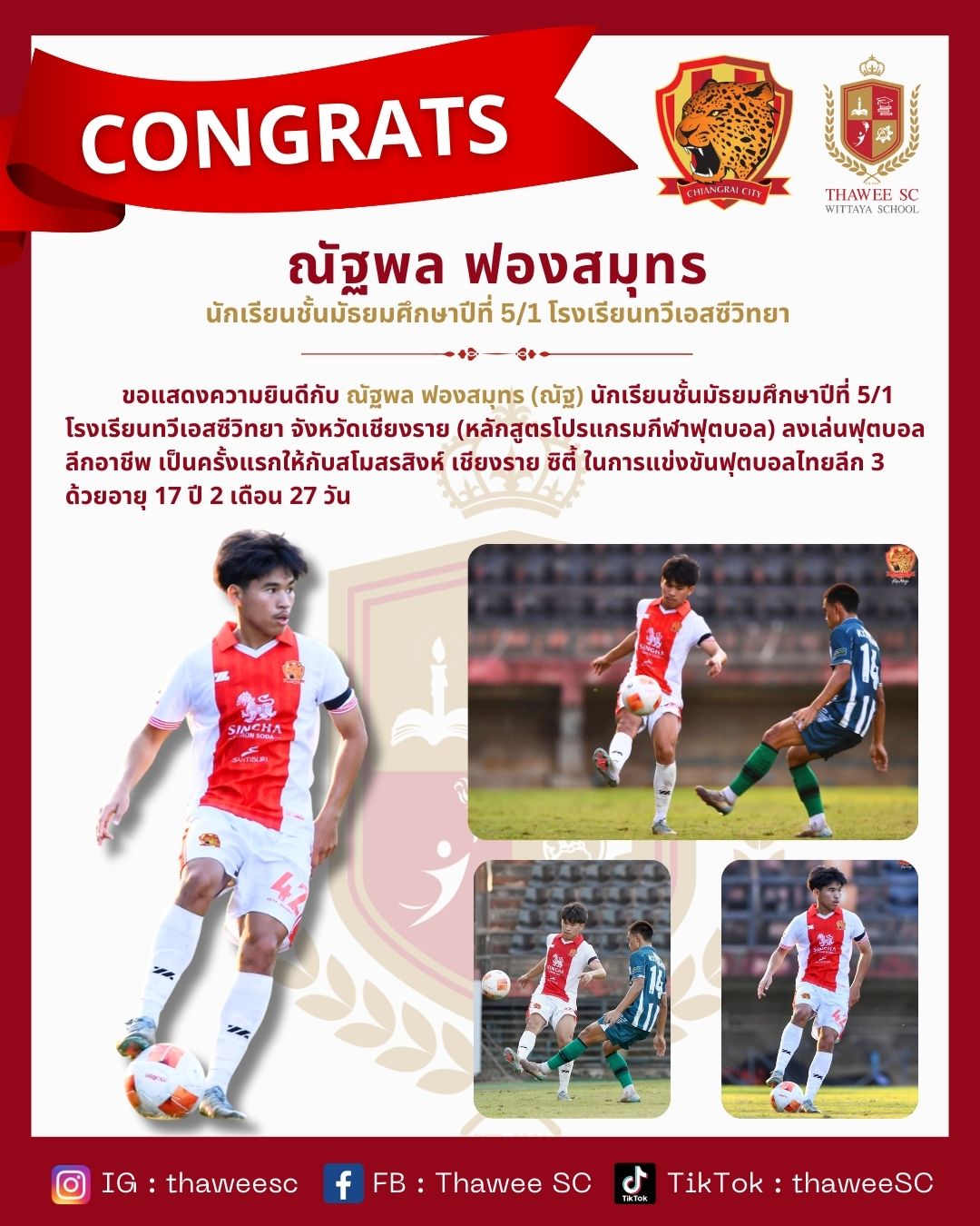 นักเรียนชั้นมัธยมศึกษาปีที่ 5/1 โรงเรียนทวีเอสซีวิทยา จังหวัดเชียงราย (หลักสูตรโปรแกรมกีฬาฟุตบอล) ลงเล่นฟุตบอลลีกอาชีพ เป็นครั้งแรกให้กับสโมสรสิงห์ เชียงราย ซิตี้ ในการแข่งขันฟุตบอลไทยลีก 3 ด้วยอายุ 17 ปี 22 วัน #โรงเรียนทวีเอสซีวิทยา #สโมสรสิงห์เชียงรายซิตี้