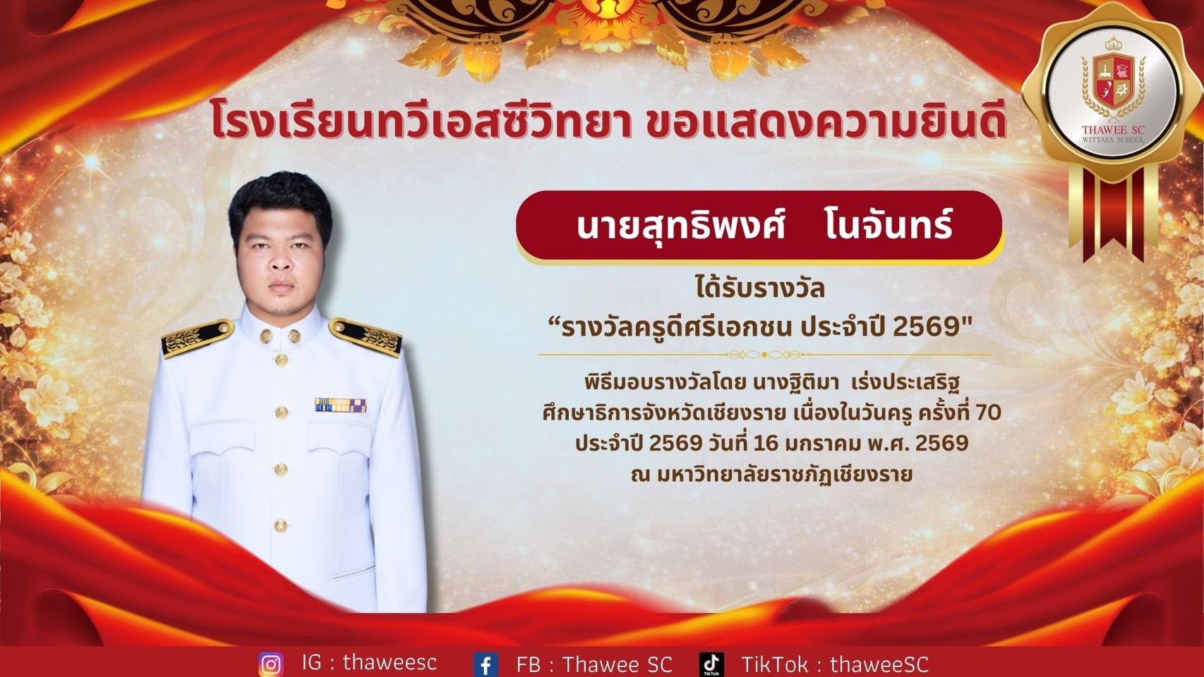 โรงเรียนทวีเอสซีวิทยา ขอแสดงความยินดี นายสุทธิพงศ์ โนจันทร์ ได้รับรางวัล “รางวัลครูดีศรีเอกชน ประจำปี 2569" พิธีมอบรางวัลโดย นางฐิติมา เร่งประเสริฐ ศึกษาธิการจังหวัดเชียงราย เนื่องในวันครู ครั้งที่ 70 ประจำปี 2569