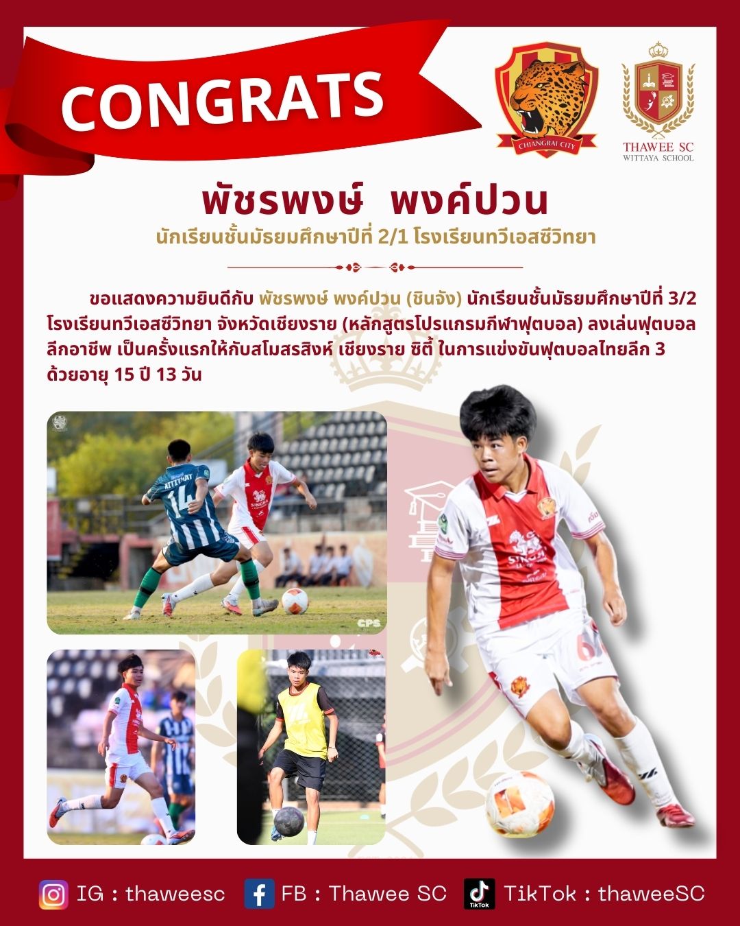 นักเรียนชั้นมัธยมศึกษาปีที่ 3/2 โรงเรียนทวีเอสซีวิทยา จังหวัดเชียงราย (หลักสูตรโปรแกรมกีฬาฟุตบอล) ลงเล่นฟุตบอลลีกอาชีพ เป็นครั้งแรกให้กับสโมสรสิงห์ เชียงราย ซิตี้ ในการแข่งขันฟุตบอลไทยลีก 3 ด้วยอายุ 15 ปี 13 วัน #โรงเรียนทวีเอสซีวิทยา #สโมสรสิงห์เชียงรายซิตี้
