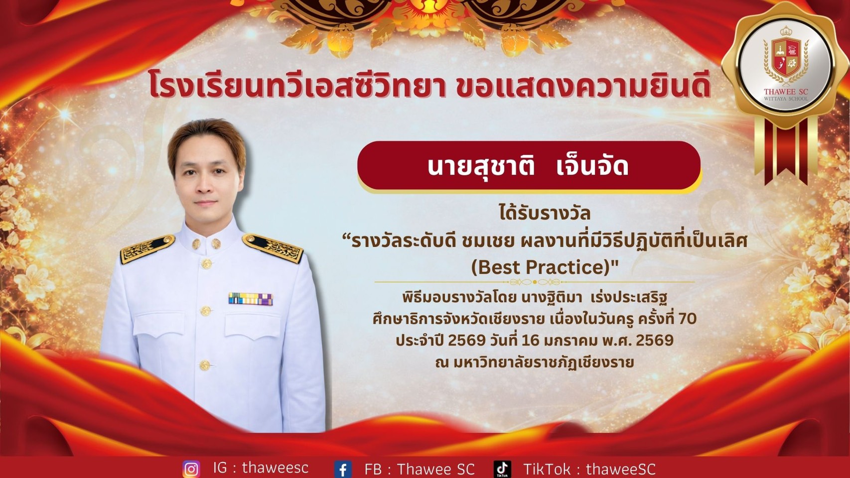 โรงเรียนทวีเอสซีวิทยา ขอแสดงความยินดี นายสุชาติ เจ็นจัด ได้รับรางวัล “รางวัลระดับดี ชมเชย ผลงานที่มีวิธีปฏิบัติที่เป็นเลิศ (Best Practice)" พิธีมอบรางวัลโดย นางฐิติมา เร่งประเสริฐ ศึกษาธิการจังหวัดเชียงราย เนื่องในวันครู ครั้งที่ 70 ประจำปี 2569