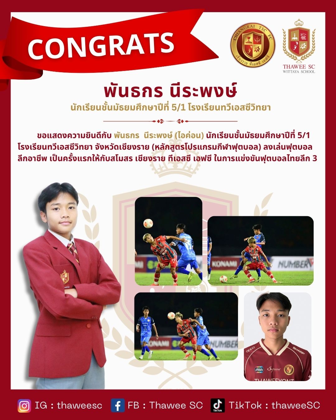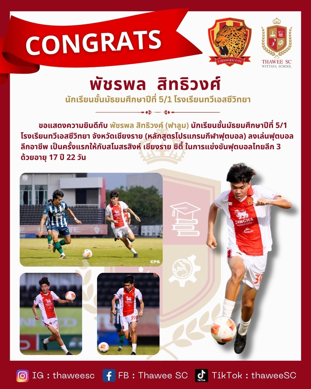 นักเรียนชั้นมัธยมศึกษาปีที่ 5/1 โรงเรียนทวีเอสซีวิทยา จังหวัดเชียงราย (หลักสูตรโปรแกรมกีฬาฟุตบอล) ลงเล่นฟุตบอลลีกอาชีพ เป็นครั้งแรกให้กับสโมสรสิงห์ เชียงราย ซิตี้ ในการแข่งขันฟุตบอลไทยลีก 3 ด้วยอายุ 17 ปี 22 วัน #โรงเรียนทวีเอสซีวิทยา #สโมสรสิงห์เชียงรายซิตี้